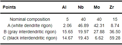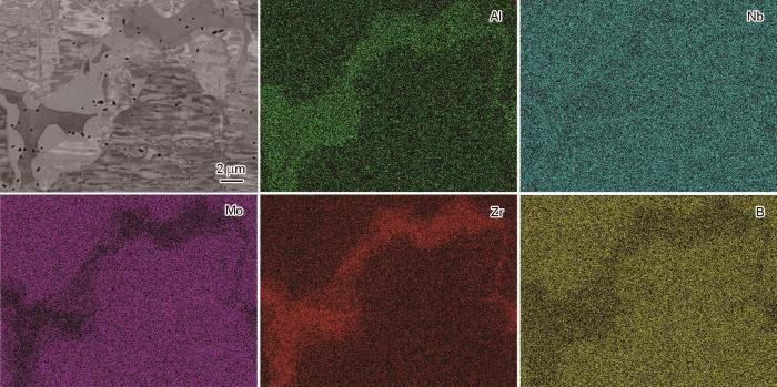 (2) AlNbMoZrB合金具有典型的树枝晶结构,枝晶区富集Mo、Nb和B元素为BCC结构基体相,而Al、Zr元素富集在枝晶间区,形成Al-Zr相及α-Zr相,B元素主要以间隙原子的形式固溶在基体中。