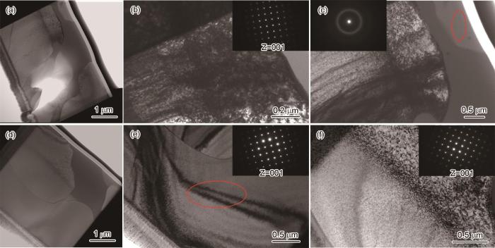 图4d~f给出了Kr离子在300℃辐照AlNbMoZrB合金样品的TEM形貌和SAED表征结果,对应的EDS结果列于表4。根据辐照影响区范围,d3和d4的位置处于未辐照区,其余位置都受到了辐照。EDS结果表明,在d1~d4的位置Nb、Mo元素富集,为BCC基体相;在d5、d7的位置Al、Zr元素富集,为枝晶间区Al-Zr相;在d6的位置Zr元素的含量高达~74.96%(原子分数),对应α-Zr相。图4e和4f分别对应d4区域和d1区域的TEM形貌和SAED图像,即辐照前后的BCC基体相。对比衍射花样可知,辐照后的合金基体仍保持BCC结构,没有发生相变。