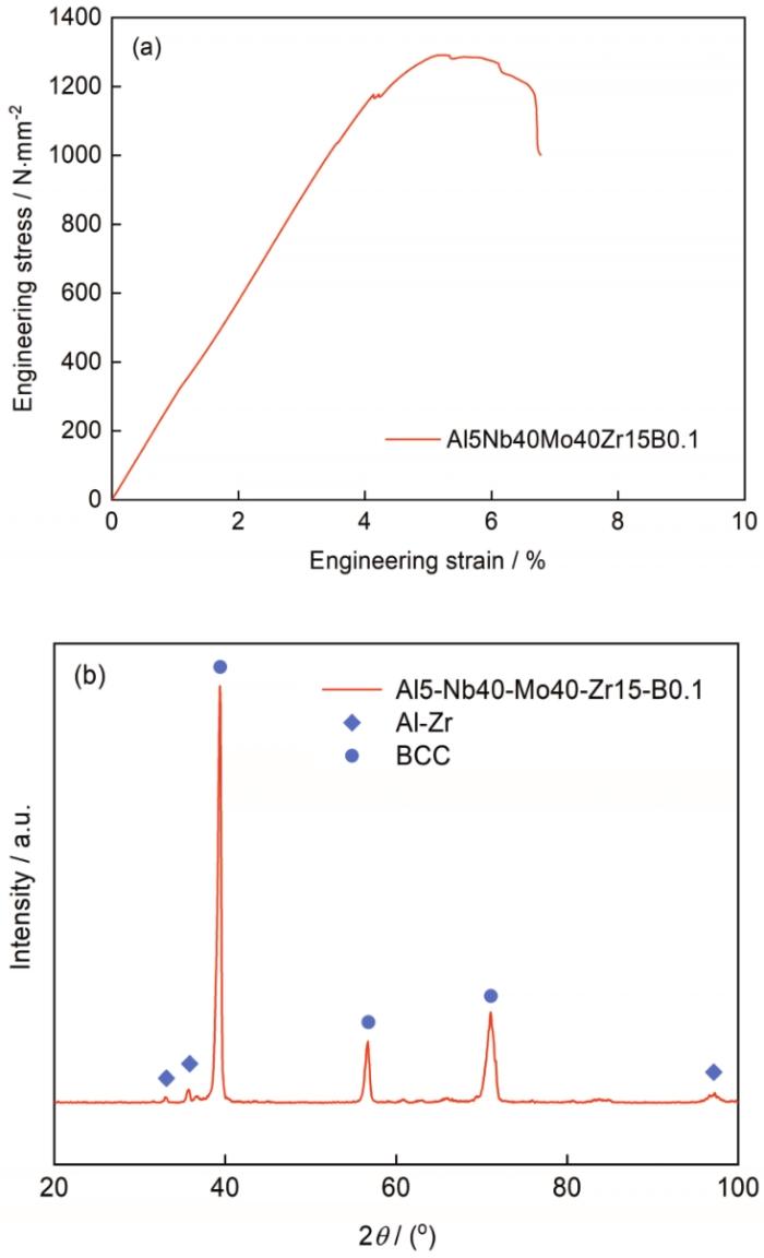 图1 铸态AlNbMoZrB合金的压缩应力-应变曲线和XRD谱