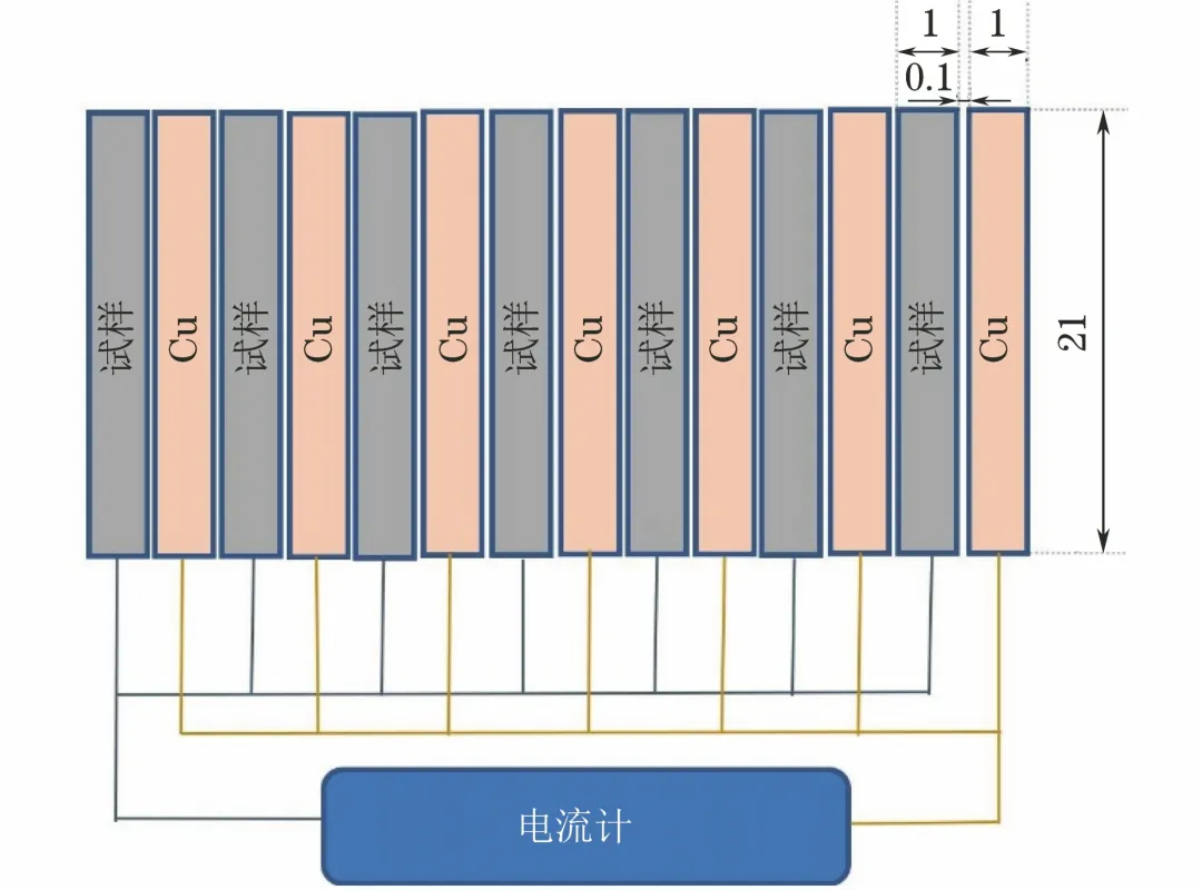 分别从同一块Q345碳钢板和纯铜板上切割传感器的阳极材料和阴极材料,且加工方向一致,加工尺寸为21 mm×12 mm×1 mm。采用雕刻机加工绝缘垫片,尺寸为21 mm×10 mm×0.1 mm,材料为玻璃纤维环氧复合板(FR4)。将阳极材料和阴极材料与绝缘垫片一对一紧密结合,用两芯镀银屏蔽线分别连接阴阳极的金属材料,并用环氧树脂进行封装。在试样组装过程中,导线连接接触点的接触电阻均小于0.1 mΩ。然后,用环氧树脂灌封胶将传感器密封,室温下固化48小时以上。