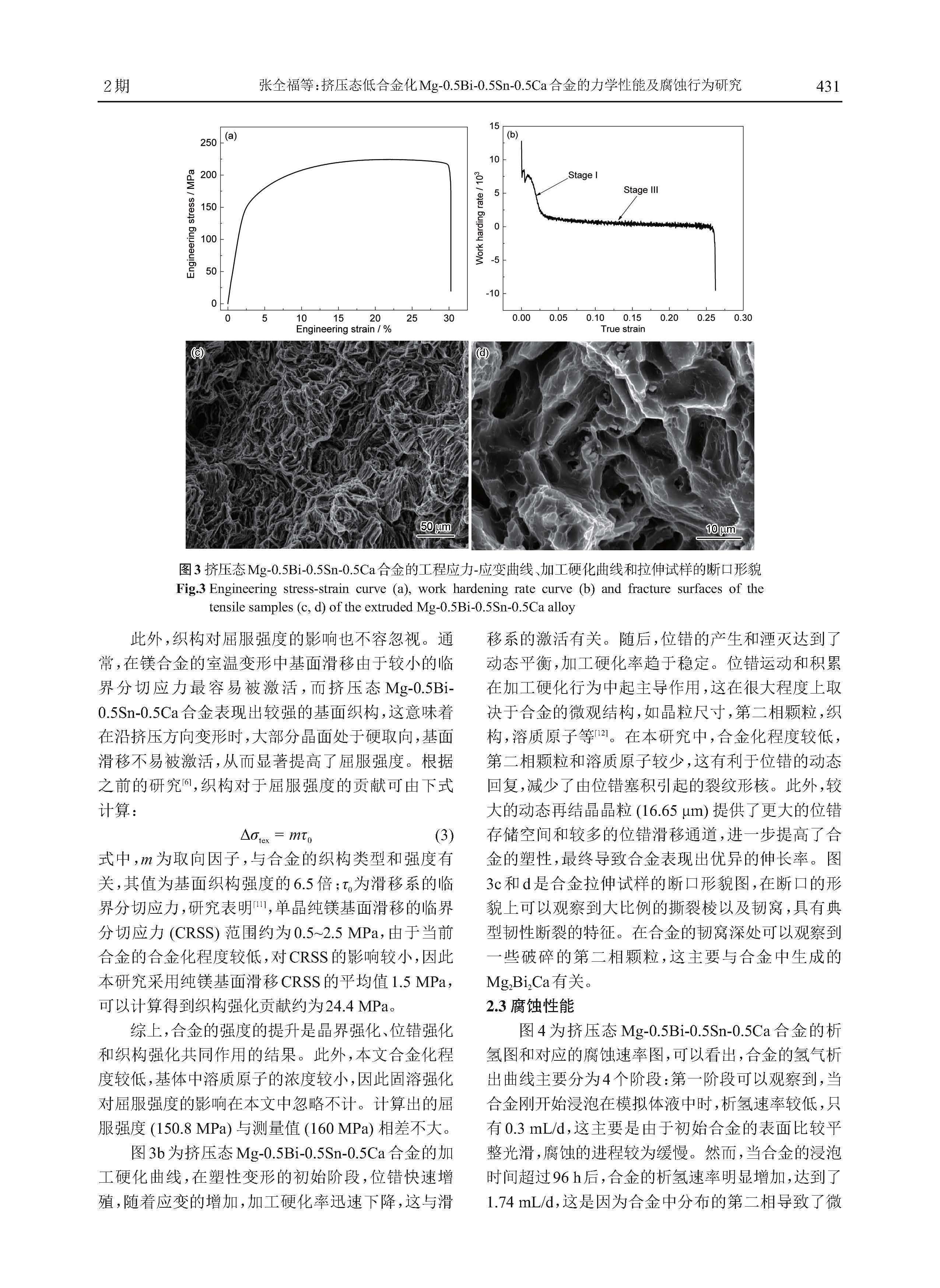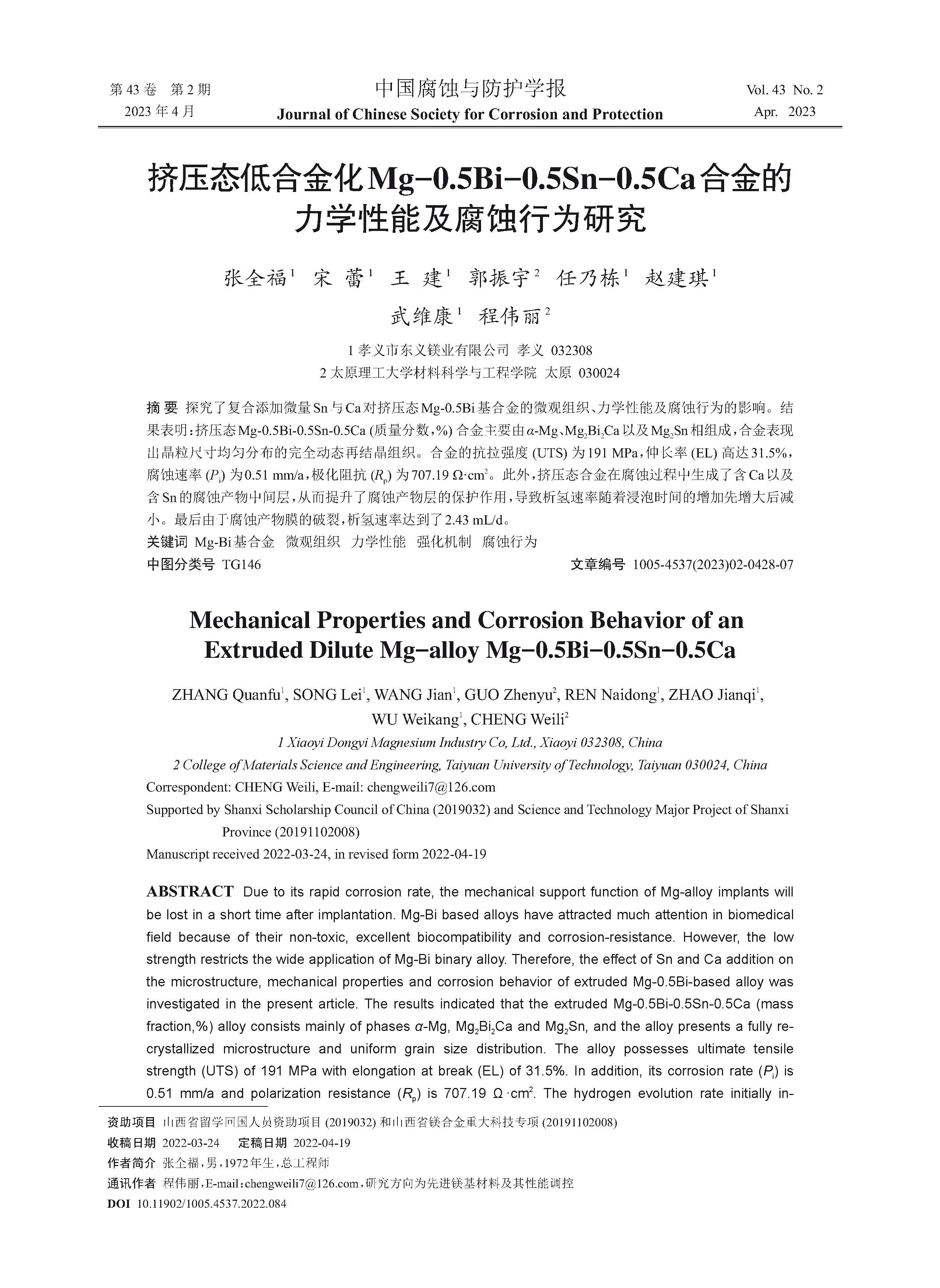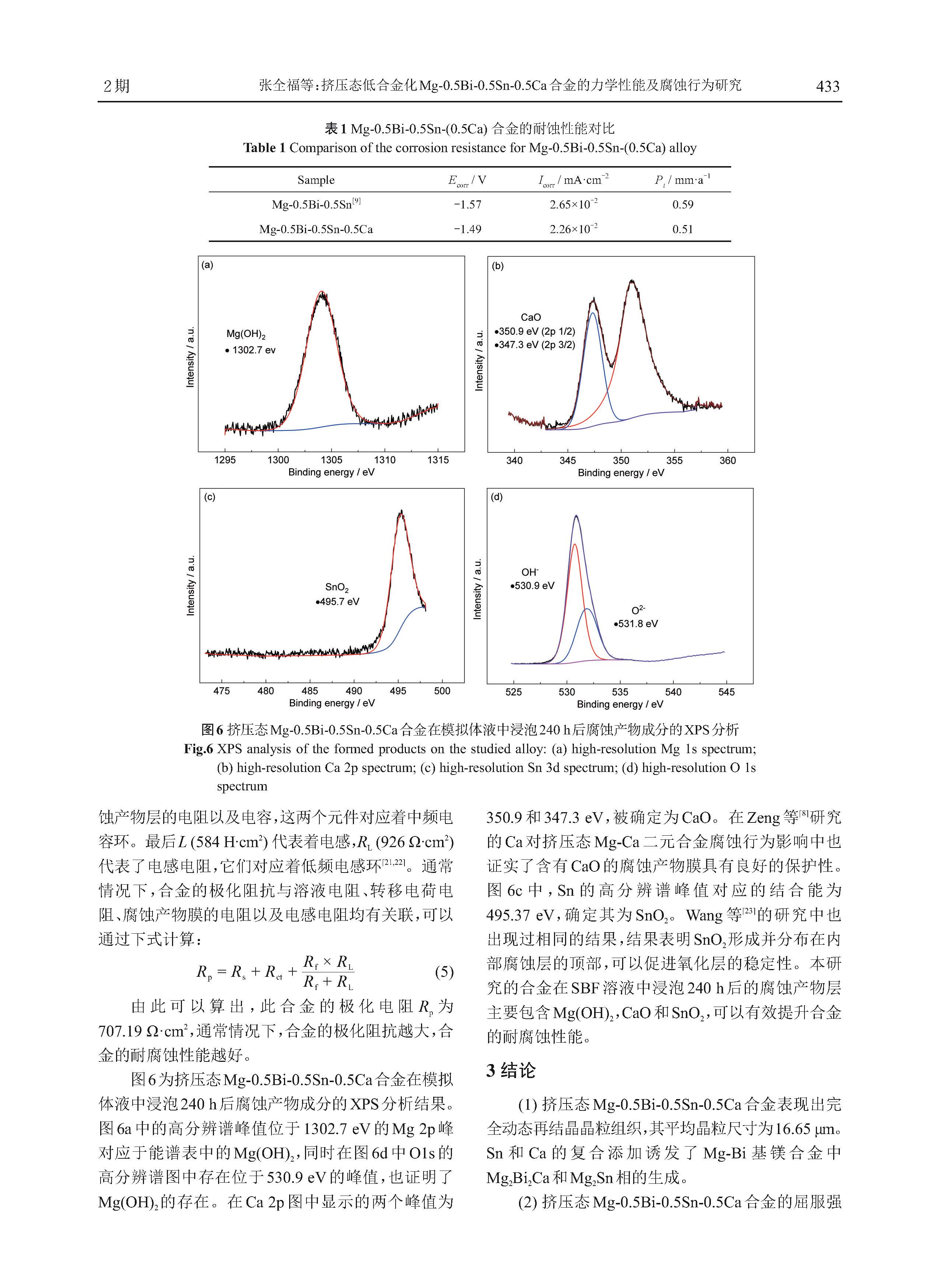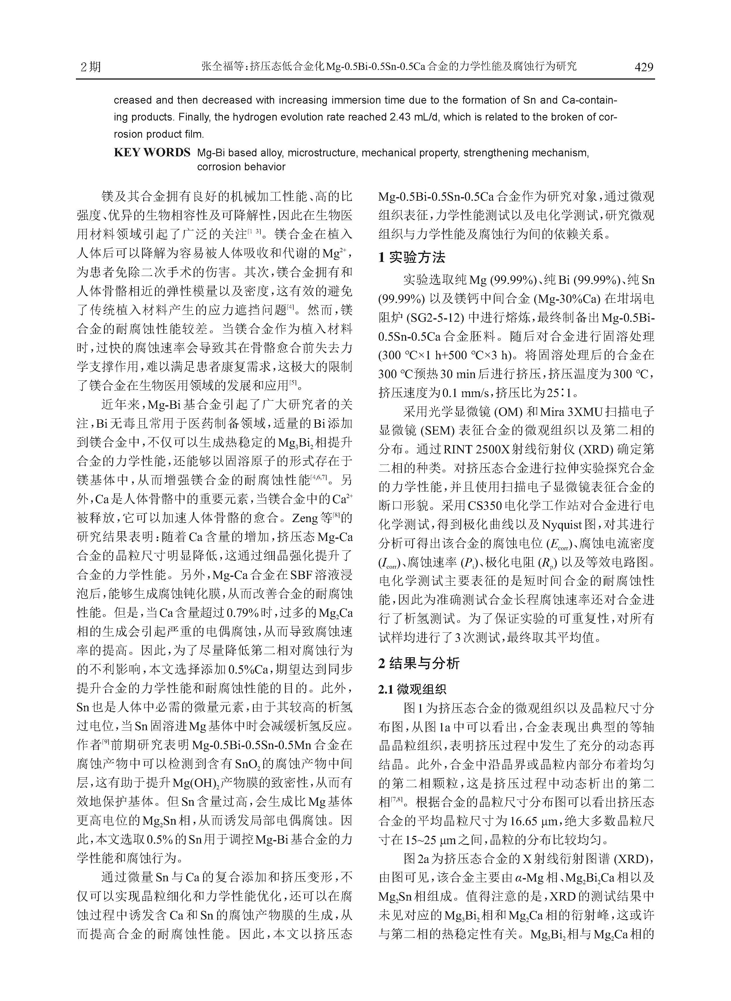 挤压态低合金化Mg-0.5Bi-0.5Sn-0.5Ca合金的力学性能及腐蚀行为研究