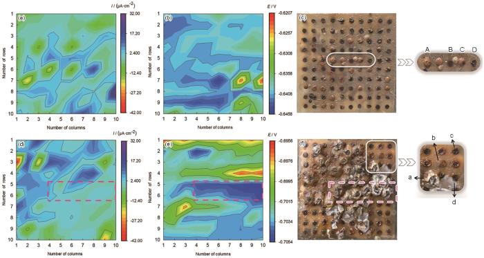 浸泡30 d,根据图1f可知,电极表面50%以上的区域被藤壶覆盖,a微电极表面被藤壶覆盖,其Icorr为1.5 μA·cm-2,Ecorr为-0.7207 V,皆明显低于周围区域,且随距藤壶距离的增加,微电极Icorr和Ecorr皆呈增大趋势。b微电极表面被较厚腐蚀产物覆盖,其Icorr为3.9 μA·cm-2,明显低于仅有少量腐蚀产物的c微电极的Icorr,高于被藤壶覆盖的a微电极的Icorr,由此推断,虽然大型污损生物层和锈层下均含有大量的异养菌、铁细菌和中性硫氧化菌[13, 14],但藤壶石灰质底壳比碳钢表面腐蚀产物层更致密,底壳抑制营养物质传输和氧气扩散作用更强,使得下方细菌活性减弱,a微电极Icorr低于b微电极Icorr。同时,更为致密的藤壶底壳抑制溶解氧的传输,造成壳下微生物群落逐渐转变为厌氧菌和兼性厌氧菌,细菌通过分解有机体,产生酸性和有机活性物质[15~18],导致pH值下降、Ecorr低于未被藤壶附着的微电极。藤壶分泌的石灰质或摄食、代谢过程中分泌的有机物,使碳钢腐蚀产物的粘附性增加,结合更为牢固。因此,临近藤壶区域的电极表面腐蚀产物多于远离藤壶区域的腐蚀产物,腐蚀产物的累积继而影响物质的传输。
