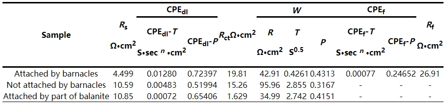 利用Zview软件对阻抗谱进行拟合,图3c为藤壶脱落和无藤壶附着时的拟合等效电路,图3d为有藤壶附着时的拟合等效电路。为了消除非理想电容对拟合结果造成的影响,使用常相位角元件CPE,CPEf、CPEdl分别代表藤壶/碳钢之间的电容和双电层电容,Rs、Rf、Rct分别代表溶液电阻、藤壶/碳钢之间的孔隙或锈蚀电阻和电荷转移电阻,Warburg阻抗用于表明碳钢受扩散控制的腐蚀反应。表1为等效电路图中各等效电子元件的拟合数值。从表中可得,有藤壶附着区域Rct为19.81 Ω·cm2,无藤壶附着区域Rct为15.26 Ω·cm2,残余壳体区域Rct仅为1.629 Ω·cm2,因Rct与金属腐蚀速率负相关,可知藤壶附着下a微电极的腐蚀速率小于未被藤壶附着的c微电极,该结果与图2d极化曲线求得的瞬时腐蚀速率具有较好的一致性。因藤壶脱落区域残余的钙质底壳逐渐被细菌分解,金属重新暴露在海水中,使得d微电极的Rct远小于a、c微电极。a微电极的弥散指数CPEdl-P大于c、d微电极,电极表面被完整的生物底壳覆盖,耐蚀性更好。
