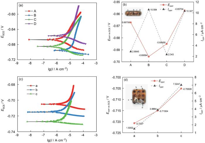 浸泡15 d,根据图1c可知,金属表面生成黄褐色腐蚀产物,表面有少数小藤壶附着。对距藤壶不同距离的4个微电极进行线性极化测试,极化曲线见图2a。图2b为距藤壶不同距离微电极的Icorr和Ecorr对比图,B和D微电极金属表面都直接暴露在海水中,二者Icorr相近,数值约为10 μA·cm-2,而B比D微电极更靠近藤壶附着位置,B微电极的Ecorr 更低,两者相差38 mV。A和C微电极表面都有腐蚀产物堆积,二者Icorr均小于仅有少量腐蚀产物覆盖的B、D微电极,腐蚀产物一定程度上会抑制金属腐蚀,而C微电极更靠近藤壶附着位置,C微电极Ecorr低于A微电极的Ecorr。由此推断藤壶附着会造成周围区域金属的腐蚀电位降低。