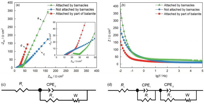 为了进一步阐明藤壶对金属表面的电化学行为的影响,选取图1f中有藤壶附着的a微电极、无藤壶附着的c微电极和表面有残余壳体的d微电极进行电化学阻抗测试。图3a和b为对应的Nyquist图和Bode图。从Bode曲线中可知,在|Z|0.01 Hz 频率下有藤壶附着微电极阻抗模值最大,为378.3 Ω·cm2,而无藤壶附着的微电极阻抗模值为237.8 Ω·cm2,有残余壳体的电极阻抗模值低于无藤壶附着的电极,仅为156.2 Ω·cm2。活体藤壶的阻隔性高于碳钢腐蚀产物的阻隔性,碳钢腐蚀产物的阻隔性高于藤壶残余壳体的阻隔性。藤壶附着对金属腐蚀起抑制作用,藤壶底壳主要成分为碳酸钙,导电性差,同时藤壶分泌的藤壶胶具有较大的内聚强度[19, 20],能将基体表面和其钙质底盘通过几微米的胶层连接起来,并通过粘腺导管网络系统运输液态胶到附着部位,液态胶又能通过流动和扩散作用,使基底与基体间的接触更为紧密[21,22],阻止海水直接与基体发生接触,限制溶解氧等成分的传输。藤壶因种内竞争导致脱落后,残余底壳中的有机质被细菌和微生物降解后其致密性大幅下降,其阻隔性大幅下降。