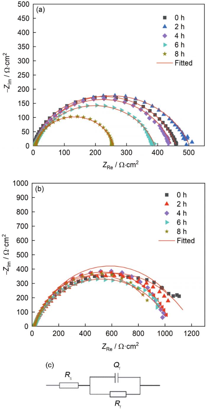 未预膜试样在环路内不同时间的EIS如图3a所示。由图可知,未预膜试样Nyquist图是近半圆的圆弧,随着时间延长,阻抗弧半径呈现先增大后减小的趋势。4 h前,随着腐蚀的进行,金属表面逐渐形成具有一定保护能力的产物膜,使其腐蚀速率减小;4 h后,阻抗逐渐减小;表明随着时间的延长,金属腐蚀加重,这与OCP测试结果一致。预膜试样在环路内不同时间的EIS如图3b所示。由图可知,随着流动时间延长,阻抗弧半径有所减小,腐蚀速率增大。与未预膜组相比,预膜后电极的交流阻抗值大于未预膜的整体交流阻抗值。这表明SRB预膜后的工作电极在流体冲刷作用下的腐蚀速率小于未预膜的工作电极,生物膜对金属的保护作用大于微生物导致的腐蚀作用。