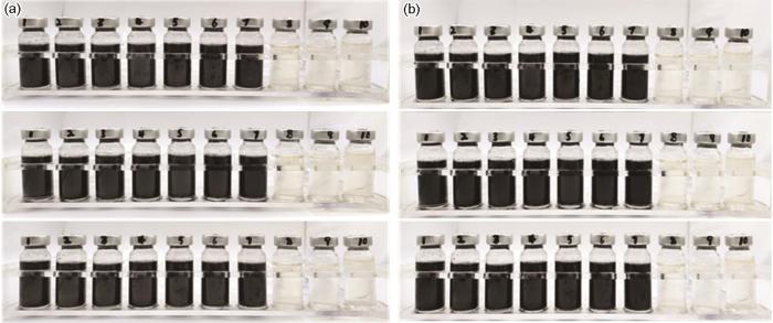 通过绝迹稀释法中的3次重复法测试不同时刻溶液中SRB的浓度 (每一组设置10个装有9 mL API RP-38液体培养基的10 mL西林瓶,编号为1~10,分别对应不同的稀释等级。后一瓶分别对前一瓶的试样稀释10倍,每组做3次平行实验)。