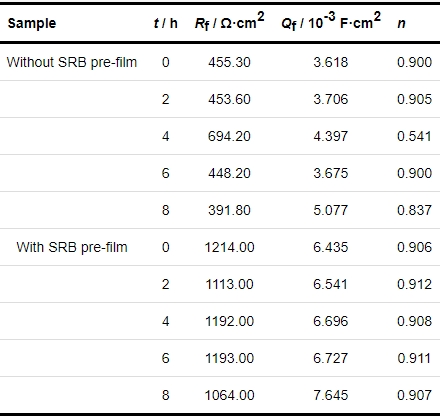 用图3c所示等效电路图对EIS进行拟合,Qf为与腐蚀产物层电容相关的恒相位元件;Rf为腐蚀产物层的电阻,相应的拟合参数见表1。可知,未预膜试样随冲刷时间延长,Rf先增大后减小,试样腐蚀4 h时,膜层电阻达到最大,表明此时金属表面形成的腐蚀产物膜使其腐蚀速率降低;Rf值在4 h后迅速减小,说明长时间的冲刷破坏了金属表面的混合膜,腐蚀速率增大,这与上述Nyquist图结果一致。预膜试样因表面已生成的生物膜和腐蚀产物膜,在实验室时间内阻抗谱的减小并不明显,且预膜试样的阻抗值均大于同时间内未预膜试样的阻抗值,表明在实验条件下预膜时所形成的混合膜对基体具有一定的保护性能;同时随着实验介质流动时间的增加,Qf先缓慢增大后迅速增大;n值在不断波动。n值不断波动的情况说明在冲刷过程中微生物膜在不断被破坏和修复,SRB形成的微生物膜层耐流体冲刷。