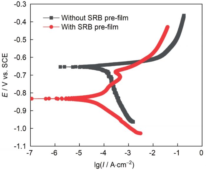 图2为35 ℃下L360钢试样在有无SRB预膜情况下的OCP随时间变化曲线。由图可知,未预膜试样OCP随冲刷时间延长产生负移,4 h后电位基本达到稳定,未预膜试样OCP负移是由于流体的冲刷作用导致腐蚀溶液中的SRB不能很好的吸附在金属表面形成具有保护性的膜层,在流体冲刷作用下金属发生腐蚀;4 h后随着腐蚀位点的形成,为SRB在金属表面的附着创造了条件,试样表面形成的腐蚀产物膜和微生物膜减弱了碳钢表面的传质过程,OCP逐渐达到稳定。与初始相比,流体冲刷8 h后试样OCP负移约50 mV。预膜试样因预先在SRB菌液中已形成较为均匀的膜层,使试样有较好抵挡流体冲刷的能力;其OCP在测试时间内较为稳定。