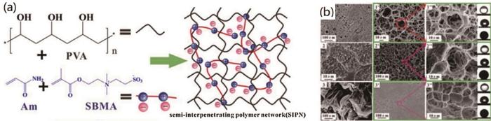 图7 半交互式聚合物网络制备工艺及SEM图像和水下油接触角[61]