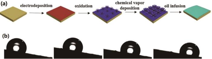图6 SLIPS构建示意图和水滴在的11.3°SLIPS斜面上滑落示意图[57]
