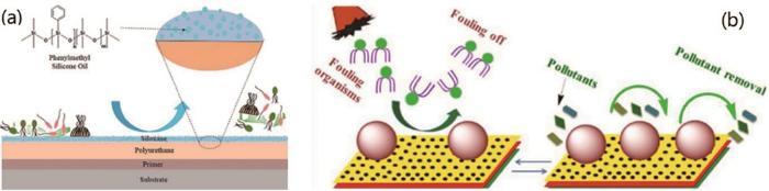 为了改善其应用性能,Webster小组[44]尝试将PDMS与更硬的聚氨酯 (PU) 混合,制备的PDMS/PU复合材料附着力明显增强 (图4a),且可有效降低大型藻类、藤壶和贻贝的粘附。此外,研究证实,向PDMS基材料添加适量微/纳米尺寸的无机填料不仅可以保持材料的疏水性能,还能够有效增强PDMS基材料的力学性能,如Selim小组[45]制备的PDMS/纳米磁铁矿自清洁复合材料具有良好的动态不粘性能,能够有效防止硅藻和细菌的附着 (图4b);向有机硅中加入0.5%纳米ZnO后,得到了防污性能较好的超疏水纳米复合材料[46],且可满足海洋环境下的长期使用;该小组还研究了基于CuO2纳米立方体与PDMS协同的纳米复合材料[47],当CuO2含量仅为0.1%时,材料具有疏水性能和有效的防污性能,然而当CuO2含量超过5%后,颗粒聚集导致表面粗糙度提高,防污性能下降;该小组对TiO2-SiO2核-壳纳米棒[48]、MnO2纳米棒[49]、碳化硅纳米线[50]等协同PDMS的研究均得到与CuO2类似的结果。