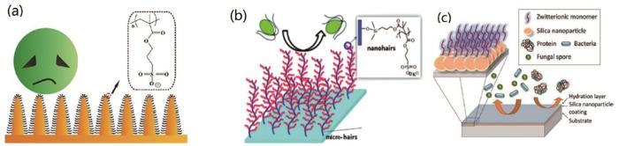 图3 PSPMA接枝到仿生三叶草结构表面[16];SI-ATRP法将PSPMA接枝到天然毛皮[23];两性磺基甜菜碱功能化二氧化硅NPs自旋包覆在金基体表面[28]