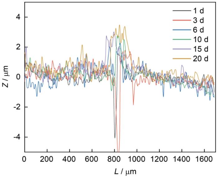 在1、3、6、10、15、20 d盐雾实验后采用激光共聚焦显微镜观察去除表面腐蚀产物的1Cr18Ni9Ti焊接接头形貌,如图6所示。在任何腐蚀时间内,焊接接头的高度均高于母材,说明焊接接头的耐蚀性高于母材,这与电化学测量结果相吻合。图7给出了盐雾腐蚀后钎焊接头与1Cr18Ni9Ti母材的高度差。随着时间的增加,焊缝和母材的高度差值逐渐增加,由腐蚀1 d的1.5 μm逐渐增加至3 μm。此外,在焊缝与母材的交界部位,靠近母材的部位存在许多点蚀坑,且点蚀坑的数量随腐蚀时间的延长而逐渐增加。