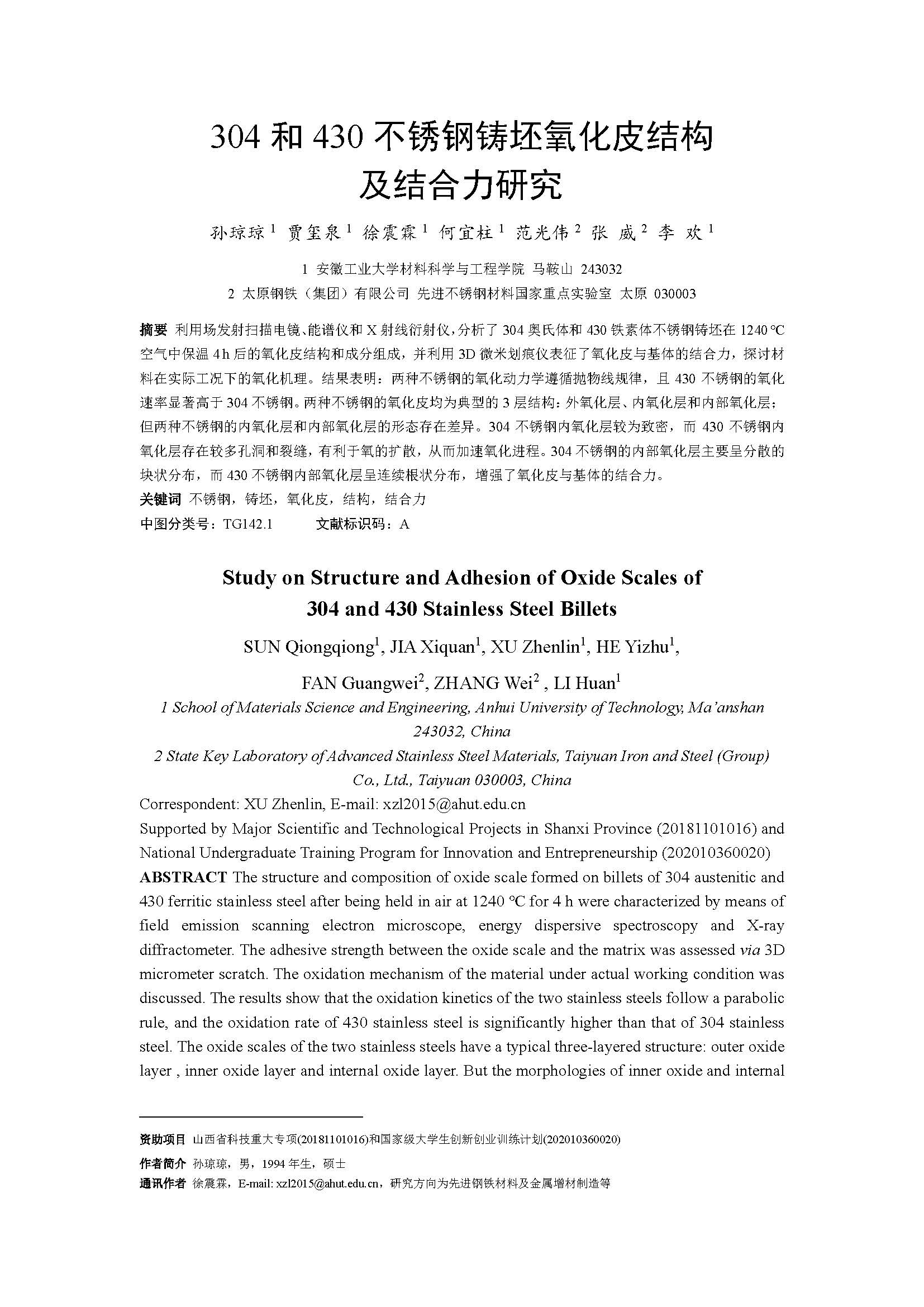 304和430不锈钢铸坯氧化皮结构及结合力研究