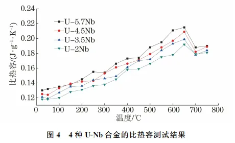 (2)当温度为室温至650℃时,U-Nb合金的比热容随着温度上升而逐渐增大。当温度超过650℃时,因U-Nb合金发生相变,其比热容显著下降。U-2Nb、U-3.5Nb、U-4.5Nb合金的相组成转变为α+γ1,U-5.7Nb合金的相组成转变为γ1。