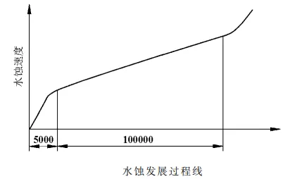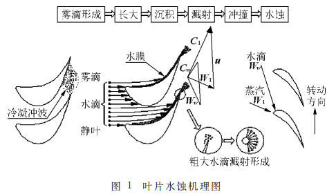 水蚀现象本质上是运动的水滴撞击叶片表面的一种能量转换过程,高速运动的水滴撞击金属的表面形成很大的瞬时作用力,作用力的大小取决于水滴的质量、相对速度和撞击的角度,当瞬时作用力超过金属材料的屈服强度时,就会在其表面造成残余变形。水滴的重复撞击在金属表面会逐渐发展成为微观的裂纹,并逐步扩大,导致金属颗粒的大量脱落,从而形成宏观上的水蚀现象。