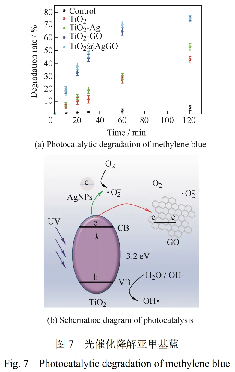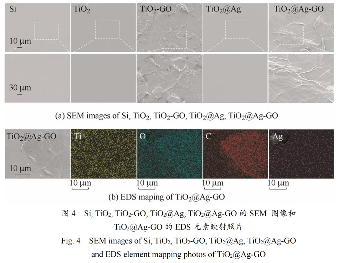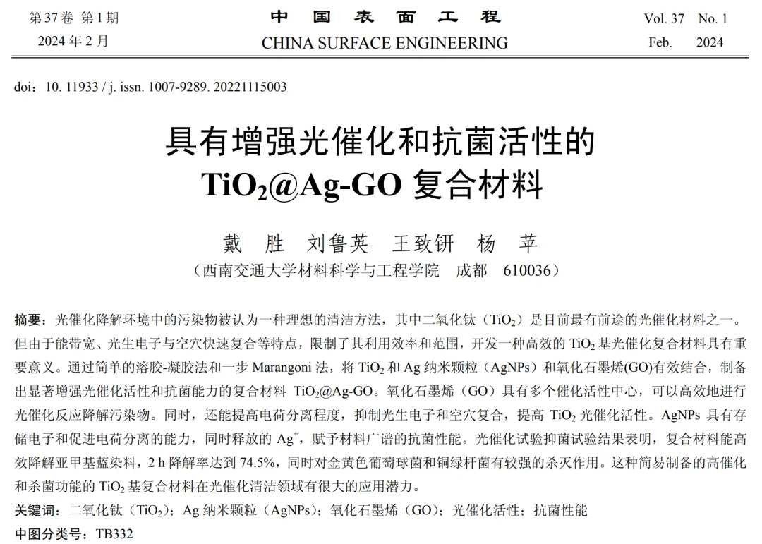 光催化降解环境中的污染物被认为一种理想的清洁方法,其中二氧化钛(TiO2)是目前最有前途的光催化材料之一。但由于能带宽、光生电子与空穴快速复合等特点,限制了其利用效率和范围,开发一种高效的TiO2基光催化复合材料具有重要意义。西南交通大学杨苹教授团队在《中国表面工程》2024年第1期发表研究论文《具有增强光催化和抗菌活性的TiO2@Ag-GO复合材料》,通过简单的溶胶-凝胶法和一步Marangoni法,将TiO2和Ag纳米颗粒(AgNPs)和氧化石墨烯(GO)有效结合,制备出显著增强光催化活性和抗菌能力的复合材料TiO2@Ag-GO。氧化石墨烯(GO)具有多个催化活性中心,可以高效地进行光催化反应降解污染物。同时,还能提高电荷分离程度,抑制光生电子和空穴复合,提高TiO2光催化活性。AgNPs具有存储电子和促进电荷分离的能力,同时释放的Ag+,赋予材料广谱的抗菌性能。 引用格式 戴胜, 刘鲁英, 王致钘, 杨苹. 具有增强光催化和抗菌活性的TiO2@Ag-GO复合材料[J]. 中国表面工程, 2024, 37(1): 118-125. DAI Sheng, LIU Luying, WANG Zhi, YANG Ping. TiO2@Ag-GO Composite Materials with Enhanced Photocatalytic and Antimicrobial Activities[J]. China Surface Engineering, 2024, 37(1): 118-125. 精彩看点 1. 论文创新点 本文将半导体TiO2、AgNPs和GO结合,制备出具有强光催化活性和抗菌能力的纳米复合光催化材料。首先制备了掺Ag的TiO2溶胶-凝胶,然后用旋涂镀膜的方法将制备的溶胶-凝胶涂覆在Si基底表面,再通过热处理制备锐钛矿型掺Ag的TiO2薄膜(TiO2@Ag)。最后,将单步Marangoni法自组装得到的大面积超薄GO膜转移到TiO2@Ag表面,成功制备出纳米复合光催化材料TiO2@Ag-GO。光催化试验和抑菌试验结果表明,该复合材料能有效降解亚甲基蓝染料,同时对金黄色葡萄球菌和铜绿杆菌具有超强的杀伤作用。因此,推测TiO2@Ag-GO 材料在光催化清洗领域有很大的应用潜力。 2. 重要结论 (1)通过溶胶-凝胶法和单步Marangoni法将TiO2、银纳米颗粒(AgNPs)和氧化石墨烯(GO)有效结合,制备出光催化复合材料 TiO2@Ag-GO。 (2)光催化试验结果证实TiO2@Ag-GO复合材料与传统纯TiO2相比,能高效降解亚甲基蓝染料,具有显著增强的光催化活性。 (3)抑菌试验证实TiO2@Ag-GO复合材料对金黄色葡萄球菌和铜绿杆菌有较强的杀灭作用。这种制备高光催化活性和抑菌能力的TiO2基复合材料的策略可能为解决环境清洁领域的许多实际问题提供一种思路。 3. 前景与应用 这种通过将TiO2、银纳米颗粒(AgNPs)和氧化石墨烯(GO)有效结合制备高光催化活性和抑菌能力的TiO2基复合材料的策略,可能为解决环境清洁领域的许多实际问题提供一种新思路。所制备出的TiO2基光催化复合材料在光催化清洗领域有较大的应用潜力。