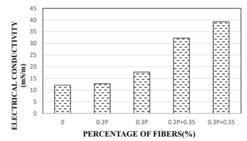 Chella等研究了钢-聚酯混合纤维的力学性能、耐久性和韧性。研究发现,混合纤维的抗拉和劈裂拉伸能力比单独掺加钢或聚酯纤维有较大幅度提升,主要原因是混合纤维在初期能抑制微裂纹产生,后期能控制裂纹的拉伸行为。加入钢纤维有利于电子的自由运动,从而使电阻率随着纤维含量的增加而降低且电导率有所提高。
