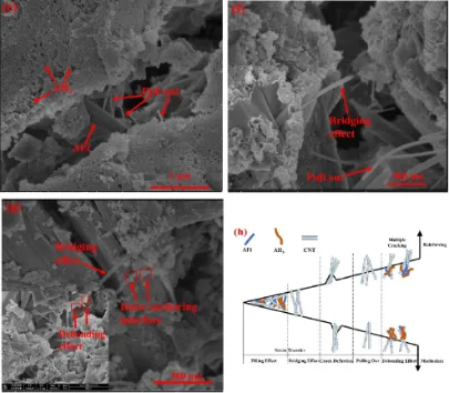 Cui等研究了在硫铝酸盐水泥中添加碳纳米管以增强界面过渡区的方法。结果表明,与未添加碳纳米管的硫铝酸盐水泥相比,其包括抗压、抗折、抗弯在内的力学性能均有较大幅度提升。另一方面,碳纳米管能够通过减少中、大型孔的体积并增加小孔和毛细孔的体积优化混凝土的孔隙结构,从而促进水泥水解,提升基质的水化程度。
