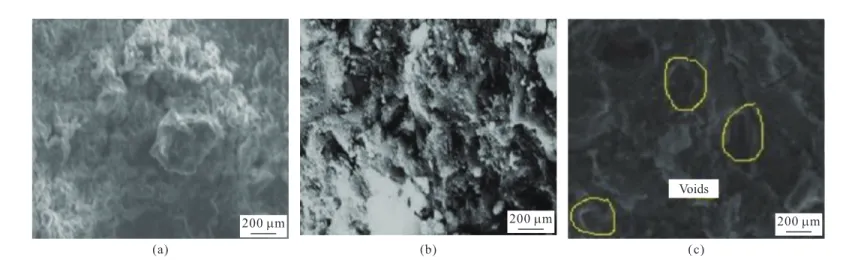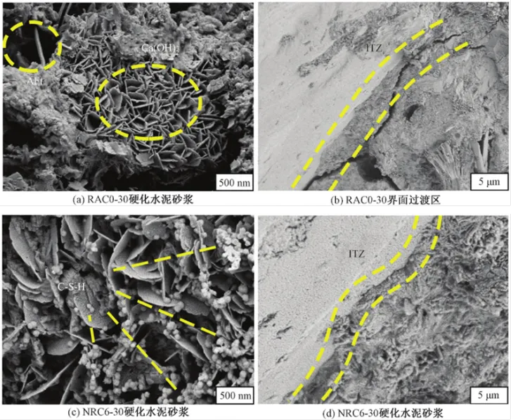 再生混凝土(RAC)是指将老旧的建(构)筑物拆除后的废弃混凝土经过破碎处理分级后,制成再生骨料,部分或者全部替代天然集料制备而成的绿色节能混凝土。再生混凝土的推广应用能有效减少天然骨料的开采,缓解废弃混凝土对自然环境的污染,为建筑固废处理提供途径。再生混凝土相比于天然混凝土存在孔隙率较高、界面过渡区复杂等缺点,导致其物理力学性能及耐久性劣于天然混凝土。了解再生混凝土耐久性的研究现状对再生混凝土的推广利用具有重大意义。陶亚平等以C30混凝土为再生骨料,采用铁尾矿砂取代天然河砂,制备出不同铁尾矿砂取代率的再生混凝土,研究再生混凝土的抗碳化性和抗冻性。试验结果表明,掺加适量的铁尾矿砂能够填充再生混凝土骨料之间的孔隙和裂缝,改善混凝土的微观结构。齐晓等对再生混凝土在冻融循环和硫酸盐侵蚀耦合作用下的耐久性进行研究。试验结果发现,再生混凝土在冻融循环初期,以冻融侵蚀为主,在冻融循环后期,以硫酸盐化学侵蚀为主,再生混凝土经化学侵蚀后生成钙矾石和石膏等膨胀产物,并出现膨胀裂缝,在冻融循环作用下裂缝迅速扩展,损伤层厚度增加。同样地,王会等也研究了冻融循环和复合盐侵蚀耦合作用下再生混凝土的耐久性,并发现在3% NaCl+5% Na2SO4溶液中再生混凝土的冻融损伤最大,再生混凝土的损伤层厚度与相对动弹性模量存在负相关,可以采用相对动弹性模量来表征混凝土的内部损伤。车志豪等采用全浸泡、部分浸泡及干湿交替三种方式研究多元胶凝材料体系再生混凝土在复合盐侵蚀下的耐久性。试验结果指出,在全浸泡条件下,粉煤灰-矿渣双掺再生混凝土相对动弹性模量下降较慢,而部分浸泡条件下,辅助胶凝材料的引入降低了再生混凝土抗复合盐侵蚀能力;干湿交替下,相比纯水泥再生混凝土,多元胶凝材料体系再生混凝土均具有较好的抗盐侵蚀能力。阎杰等通过采用煅烧纳米凹凸棒土(NAT)改善再生混凝土性能,研究再生骨料取代率和煅烧NAT掺量对再生混凝土抗氯离子侵蚀能力的影响。结果表明,随再生骨料取代率增加,再生混凝土的抗氯离子侵蚀能力逐渐降低;掺加煅烧NAT后,可以使再生混凝土的孔隙和裂缝减少,优化微观结构(图6),提高抗氯离子侵蚀的能力;当再生骨料的取代率为30%、煅烧NAT掺量为6%时再生混凝土具有最优的抗氯离子侵蚀性。