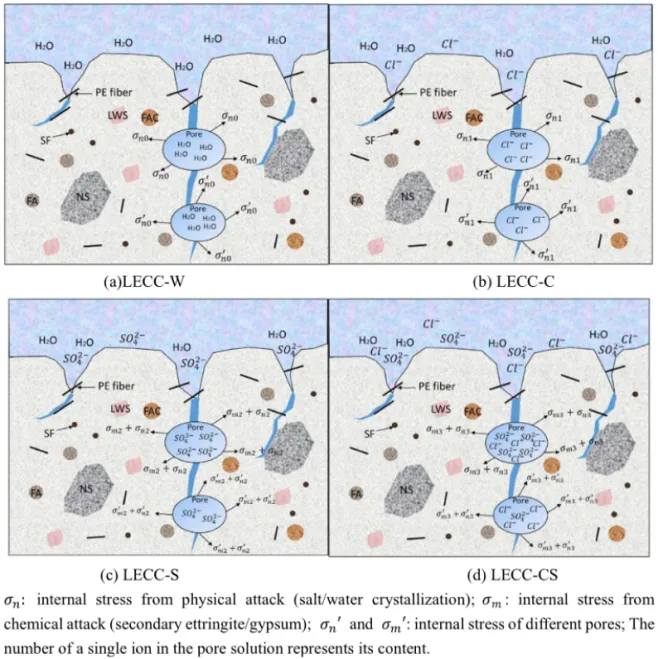 图2 冻融循环下不同环境中LECC的破坏机理