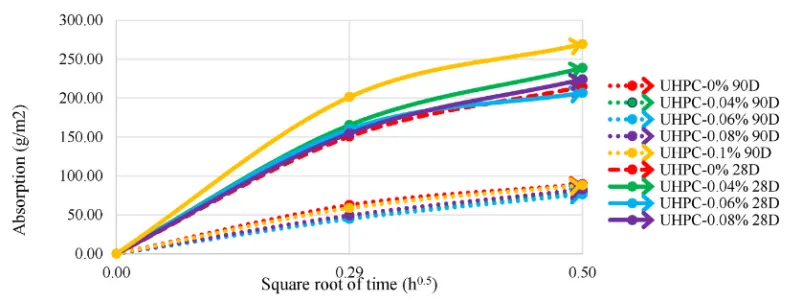 图14 不同配合比试件在28和90天龄期的初始吸水率