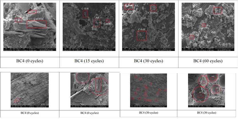 Boakye等研究了煅烧粘土-硅灰-水泥三元混合水泥基体系的耐久性能。煅烧黏土和硅灰都具有明显的火山灰反应属性,二者协同作用能够与氢氧化钙反应,促进水化硅酸钙的形成。同时掺入硅灰可以使混凝土孔隙率减小,硅灰含量越高,混凝土的孔隙率越小。研究表明,煅烧粘土-硅灰复合水泥具有更强的抗硫酸盐侵蚀能力,但加入硅灰后混凝土的干缩比增大,且加入30%硅灰时混凝土具有最优的抗冻融能力。