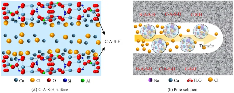 碱激发胶凝材料又被称为地聚物,是指富含硅铝并具有潜在水硬活性,在碱性激发剂作用下能够硬化形成强度的一类新型无机胶凝材料,又被称为“绿色水泥”。这种材料主要以各种工业废弃物(如粉煤灰、矿渣、煤矸石等)或硅铝酸盐矿物(如偏高岭土等)为原料,具有水化产物稳定,硬化浆体结构致密,碳排放远比普通硅酸盐水泥小,抗压强度、抗化学侵蚀、耐高温等性能比硅酸盐水泥好,具有消纳工业固废的优点,近年来因可替代硅酸盐水泥制备地聚物混凝土而备受关注。目前国内外学者对地聚物混凝土的各项力学性能研究较为深入,而对耐久性的研究相对较少,为此总结了地聚物混凝土耐久性的最新研究进展。刘新宇等通过加入氧化石墨烯对地聚物再生混凝土进行改性处理,对其抗硫酸侵蚀性能进行研究。研究发现,掺入少量氧化石墨烯可显著提高混凝土的抗硫酸性能,但抗硫酸性能随掺量增加逐渐减弱,并且掺量过大会对混凝土产生负面影响。当氧化石墨烯掺量为0.01%时,地聚物再生混凝土具有最优的抗硫酸性能,此时地聚物再生混凝土的ITZ较为密实,骨料浆体结合良好,未产生明显裂缝,并且可观察到N-A-S-H凝胶,显著优化了地聚物再生混凝土的微观结构。Dima等研究碱激发自密实混凝土的抗硫酸盐侵蚀性能,将样品部分浸没在钠、镁和混合硫酸盐溶液中,样品可能会发生双重硫酸盐侵蚀,即浸泡部分会发生化学侵蚀,而未浸泡部分会发生物理侵蚀。研究发现,保持硫酸溶液中的pH值将会增加混凝土的损伤速率;Na2SO4溶液引起混凝土性能劣化的主要原因是形成了石膏,而MgSO4溶液引起混凝土性能劣化的主要原因是形成了钙矾石。Fu等研究了流动NaCl溶液和荷载耦合作用下对基于粉煤灰的地聚物混凝土氯离子传输性能的影响。研究发现,混凝土中氯离子主要以游离形式存在,流动盐溶液的冲蚀和荷载作用均促进了氯离子的传输,两者的耦合作用对混凝土应变区氯离子传输的促进作用最为显著。同时,流动盐溶液的侵蚀作用会降低C-(A)-S-H凝胶的稳定性,氯离子在纳米孔中的迁移和吸附情况见图4,荷载作用会促进氯离子向混凝土拉伸区转移,流动的盐溶液增加了混凝土内中等毛细管和大孔的数量,而流动盐溶液和荷载的耦合作用增加了拉伸区的大孔数量以及压缩区的凝胶孔数量。