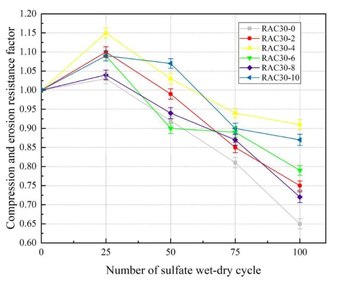 Jia Luo等从质量损失、抗压强度、超声波声速值和微观结构角度研究了对纳米SiO2和再生混凝土骨料的协同作用进行25、50、75和100次硫酸干湿循环的影响。结果表明,纳米SiO2可以使再生混凝土骨料水化更充分,水化产物填充基体界面,改善界面结构,最终在硬化浆体中形成更致密的网状结构,增强了抗硫酸盐侵蚀的能力。结果指出,掺入4% SiO2,诱导的水化效应和火山灰效应可以充分发挥作用,加速水化过程,是提升再生混凝土骨料抗硫酸盐侵蚀性能的最优掺量。