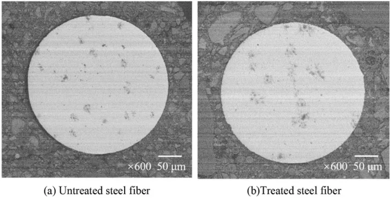 超高性能混凝土(UHPC)是一种使用大掺量胶凝材料、无粗骨料、水胶比极低的水泥基复合材料,具有超高的耐久性和超强的力学性能,其主要成分包括普通硅酸盐水泥、微硅粉、石英砂、高效减水剂、各类钢纤维等。目前国内外关于UHPC的研究已经有很多,由于传统的UHPC成本较高,一些学者采用低成本的原料取代原有高成本的原料来制备UHPC,下面对这种新型UHPC耐久性的研究进展进行总结。元成方等采用机制砂取代石英砂来制备UHPC,并对UHPC的抗冻性以及冻融循环后的抗氯离子渗透性进行研究。研究发现,机制砂UHPC在经历1000次冻融循环后,其质量损失控制在0.3%以内,动弹性模量损失控制在5%以内,抗压强度仍能保持100MPa以上,具有优异的抗冻性能。冻融循环会使得UHPC氯离子扩散系数增大,冻融介质中存在氯离子会加速机制砂UHPC的冻融损伤,因此机制砂UHPC在盐冻条件下的劣化较水冻更加明显。钢纤维添加到UHPC基体内会在界面处形成一个过渡区,有研究表明使用硅烷偶联剂(SCA)处理钢纤维表面可以改善纤维和基体间的粘结性能,DU等研究不同含量的未经处理的钢纤维和经过SCA处理的钢纤维对UHPC耐久性的影响。结果显示,钢纤维与UHPC基体间的BSEM图像见图5,用SCA处理钢纤维可以显著缩小基体和钢纤维之间的孔隙空间,同时增强了钢纤维表面水化产物的生成;钢纤维表面SCA处理提高了UHPC耐电化学腐蚀性、抗氯离子侵蚀性、抗硫酸盐侵蚀性以及抗冻性。