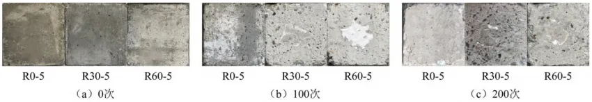 图1 不同再生骨料取代率混凝土在冻融过程中的表观形态
