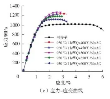 不少学者认为对钛合金进行一系列的改进处理可以增强它的某些性能。Chun等对此提供了一些证据,他们研究了时效处理对Ti-5Al-3V-1.5 Mo-2Zr钛合金钻杆组织和力学性能的影响。原始试样的抗拉强度为972 MPa,屈服强度为885 MPa,伸长率为15%,硬度为325 HV0.3,经过不同温度时效处理后,钛合金钻杆材料的力学性能发生了明显变化,研究结果显示处理后Ti-5Al-3V-1.5Mo-2Zr钛合金的β晶粒尺寸增大,晶界清晰,α相聚集,晶界α相消失。初生层片状α相尺寸增大,次生α相体积分数逐渐增大。后采用CMT5105拉伸试验机,按照GB/T 228.1—2010进行力学性能试验,发现强度增大,伸长率降低。随着时效温度的升高,硬度先升高后降低(图1a),与原试样相比,拉伸强度和屈服强度明显提高,伸长率降低(图1b),而Ti-5Al3V-1.5Mo-2Zr钛合金钻杆材料的屈服现象不明显,在应力-应变曲线上没有明显的屈服平台(图1c)。时效后α/β界面位错堆积提高了合金的强度,二次相析出越多、晶粒越小,强化效果越显著。
