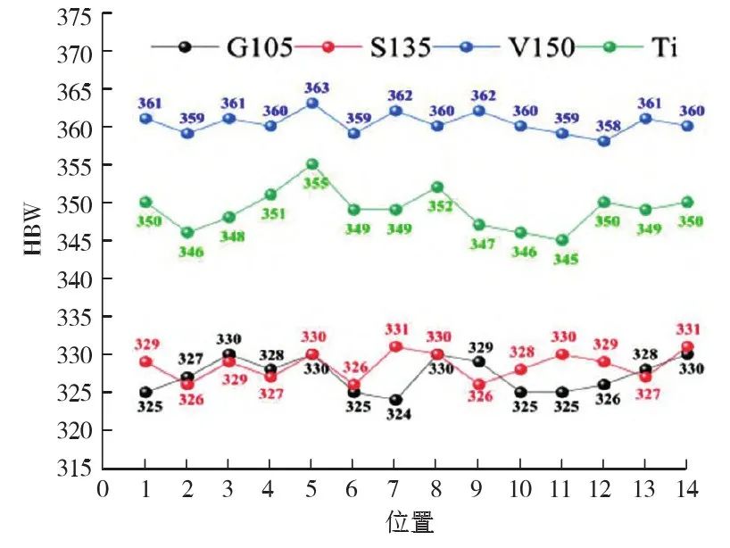 图2 G105、S135、V150和钛合金钻杆的硬度分布