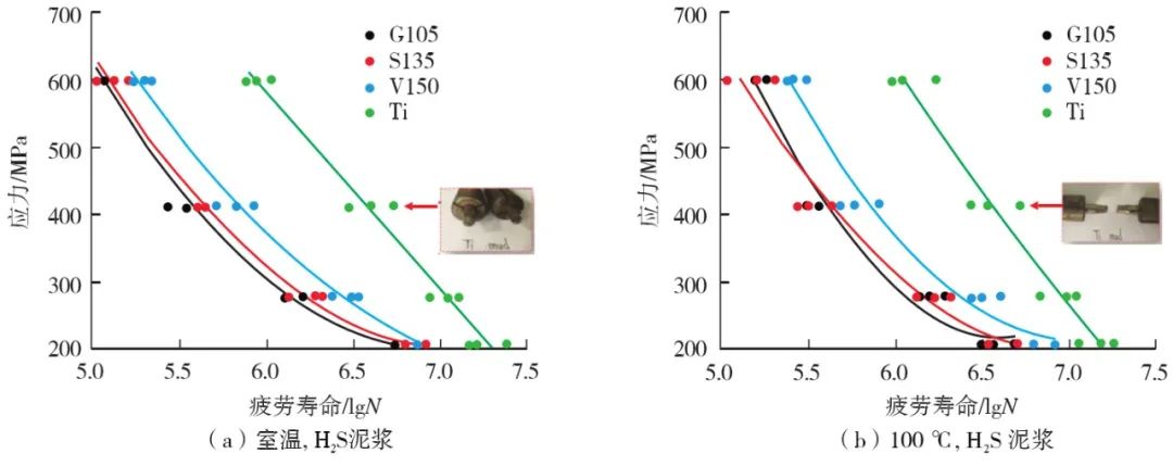 Peng等对钛合金钻杆的疲劳性能进行了评价,结果表明在空气中,随着钢种等级的提高,钻杆的疲劳寿命会延长,而在钻井泥浆中,钛合金钻杆的疲劳性能最好。图3a显示了不同钻杆试样在室温H2S泥浆下的疲劳曲线,H2S泥浆的存在会大大降低每个钻杆试样的疲劳寿命,说明钻杆对H2S泥浆具有较高的敏感性。在H2S泥浆环境下,钛合金钻杆的疲劳寿命显著高于G105、S135和V150等钢钻杆。图3b绘制了100 ℃、H2S泥浆中不同钻杆的S-N曲线,与室温空气相比,G105、S135、V150和Ti试样的疲劳寿命显著降低。H2S泥浆与温度的耦合因素比单一因素对钻杆疲劳寿命的影响更大。在这种耦合条件下,钛钻杆的疲劳寿命仍比其他钻杆具有较大的优势。