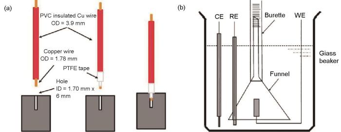 失重测试是金属腐蚀速率最简单、常用的方法,通过测试固定实验时间内样品腐蚀测试前后质量变化,可以提供腐蚀表面形貌分析,但只能提供暴露期间的平均腐蚀速率,且这个速率通常会随着时间而变化[5]。镁合金腐蚀产物通常采取硝酸银和铬酸的混合溶液去除,但是可能因为清洗不足或过度清洗导致的腐蚀速率被低估或高估。失重测试所得高纯Mg在浓的NaCl溶液中的本征腐蚀速率为0.3 mm/a[6]。上述方法测试主要用于镁合金自腐蚀的腐蚀速率。为了测试电化学极化镁合金的失重腐蚀速率,避免封装材料和连接线去除等问题的困扰,Shi和Atrens[7]设计了未封装的Mg电化学试样。如图1a所示,首先在立方体Mg样品的侧面钻取一个内径为1.70 mm的孔,然后将外径为1.78 mm部分包裹聚四氟胶带的裸铜线压入Mg样品侧面的孔内,制备坚固机械接触和良好电连接的电化学Mg试样。聚四氟胶带可以确保Mg样品和铜导线之间没有裂缝,从而电解液无法接触到铜导线。测试装置如图1b所示,测试后Mg样品可以从铜导线上取下,而不会对Mg带来任何损失或增重。去除Mg腐蚀产物后,精确测量Mg试样的质量损失。该方法已经被用于镁合金负差数效应的理论研究之中,但样品的8个角和12条棱边都暴露在溶液中,它们的行为显然不同于平面,而且底面、侧面、顶面的暴露条件也略有不同,这些都会对腐蚀结果造成影响,结果分析时应加以区别。