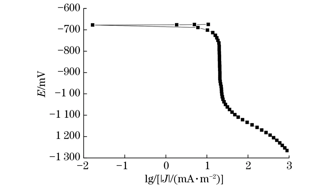 假设海底管道及其阴极保护系统区域被表面Γ包围,则有:Γ=ΓA+ΓC+ΓI。式中:ΓI为绝缘表面,采用恒定电流密度作为边界条件,绝缘表面无电流流入流出,电流密度为零;ΓC和ΓA分别为阴极保护系统中海底管道和牺牲阳极的外表面,边界条件常根据极化函数确定,该函数表示了极化电流密度J与极化电位E之间的关系,可通过试验测量确定,即:J=f(E)。