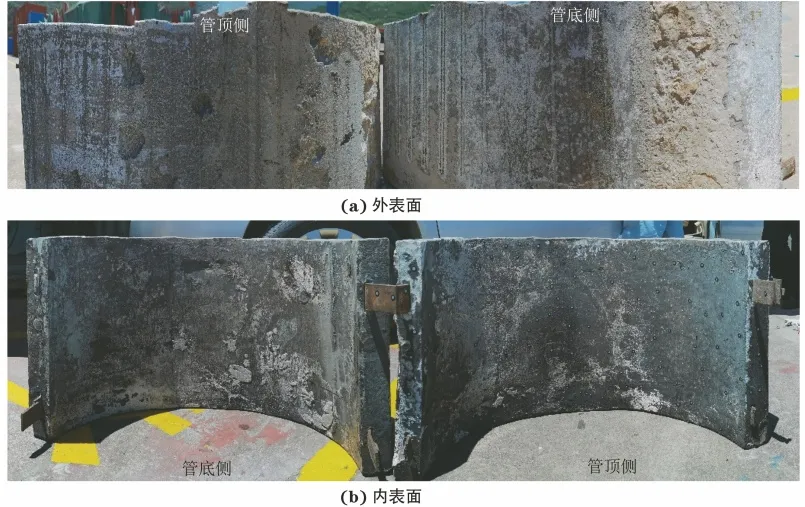 由图4可以看出:除了牺牲阳极外表面的管顶侧有较大缺陷外,其他表面阳极消耗较轻;牺牲阳极外表面管顶侧的缺陷主要是由拆除作业过程中的冲击力造成的,有几处为腐蚀坑。