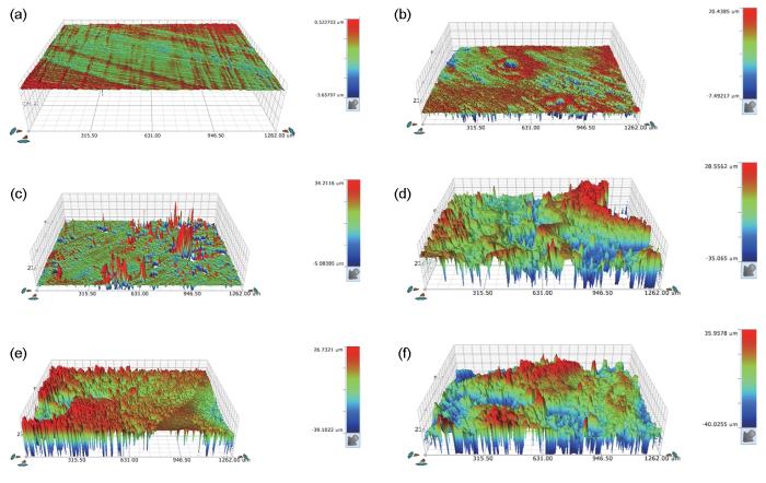 Fig.3 3D morphologies of WH-HMS after salt spray corrosion for 0 h (a), 12 h (b), 48 h (c), 96 h (d), 168 h (e) and 240 h (f)