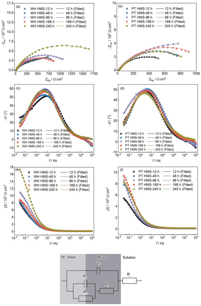 Fig.7 EIS of WH-HMS (a, c,e) and PT-HMS (b, d, f) and electrochemical equivalent circuit (g) after salt spray corrosion for different time