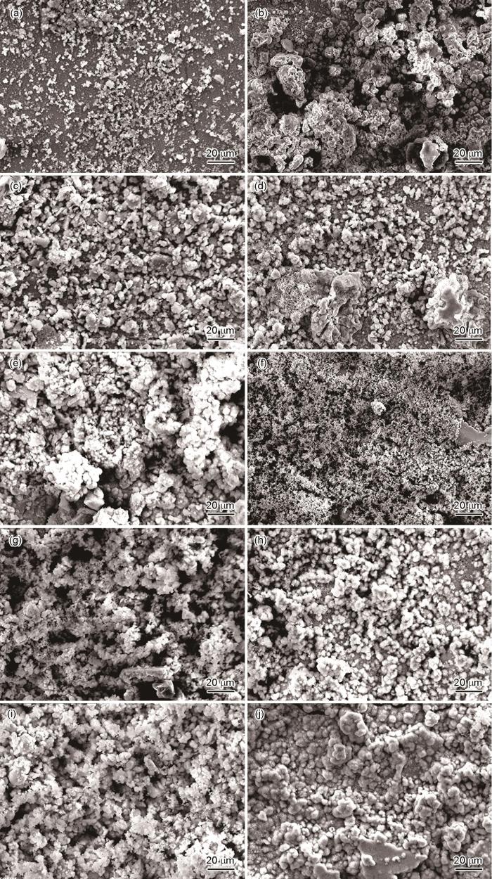 Fig.5 Surface morphology of the rust removal layer of WH-HMS for 12 h (a), 48 h (c), 96 h (e), 168 h (g), 240 h (i) and PT-HMS for 12 h (b), 48 h (d), 96 h (f), 168 h (h), 240 h (j) after salt spray corrosion