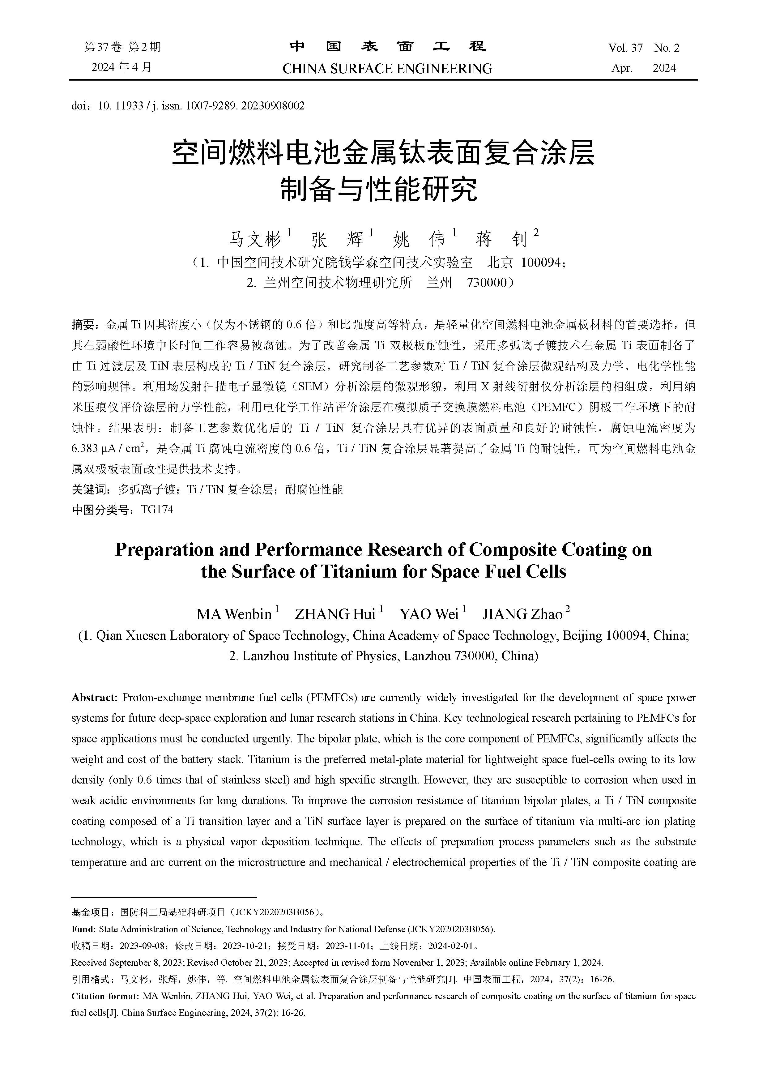 空间燃料电池金属钛表面复合涂层制备与性能研究