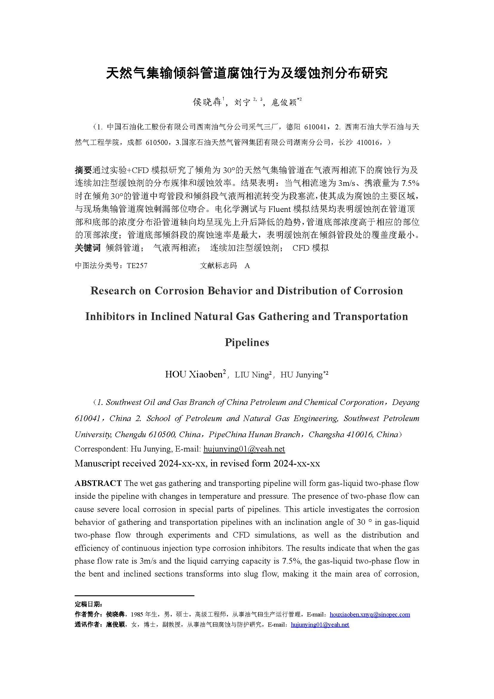天然气集输倾斜管道腐蚀行为及缓蚀剂分布研究