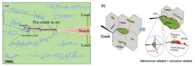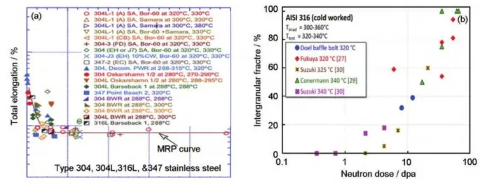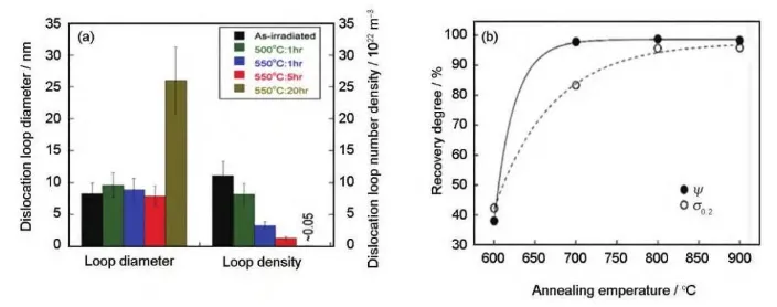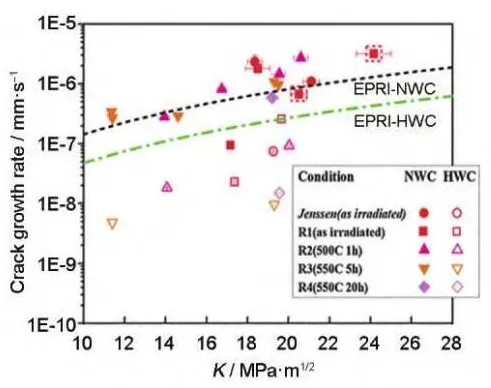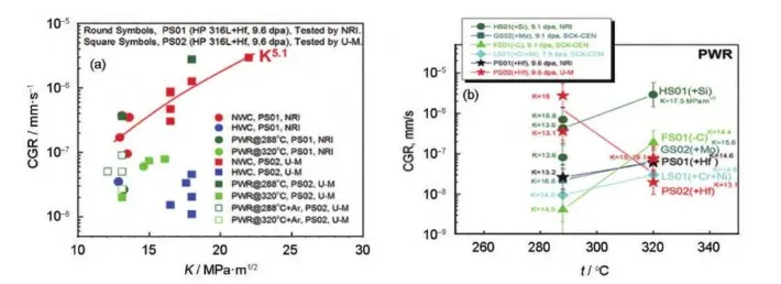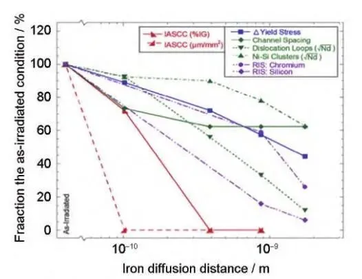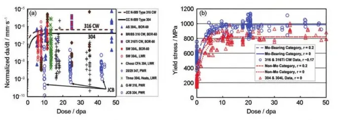 奥氏体不锈钢因为具有较好的力学性能、加工性能和耐腐蚀性能被选为反应堆堆内构件的主要结构材料。当前核电站的服役寿命正致力于延长至60年或更长时间,堆内构件材料在寿期内将受到高达80dpa的中子辐照。此时,材料将受到严重的辐照损伤(如:辐照诱导相结构、空洞 、位错环等), 进而降低其力学性能和耐腐蚀性能,导致材料抗应力腐蚀性能(SCC) 降低,并进一步诱发辐照促进应力腐蚀开裂(IASCC)。IASCC是导致轻水堆 (LWRs)堆芯部件开裂乃至失效的关键原因之一。自20世纪60年代300系列不锈钢燃料棒包壳第一次发生IASCC事故以来,先后在沸水堆(BWRs)的高应力组件、低应力组件、焊接堆芯管以及压水堆堆内构件等关键部件发现了IASCC现象。 SCC本身是一种应力、环境和材料微观结构等多因素耦合的现象 ,在IASCC中,由于辐照又可与各因素发生相互作用,使得其多因素耦合的行为和机制变得更加复杂。此外,水的辐照分解也曾被认为对IASCC有重要影响,但之后的研究表明,向冷却剂中添加H2可降低辐照分解产物的生成率,从而抑制水的辐解,所以对IASCC几乎无影响。国际上对奥氏体钢的 IASCC现象已开展一系列试验研究,以期掌握中子辐照IASCC行为机制,实现对堆内构件老化状态和寿命的有效评估。由于中子辐照样品稀少且具有放射性,国内目前主要开展了基于离子辐照的IASCC试验研究,因为离子辐照效率高、成本低以及感生放射性极低,在IASCC机制研究中颇具优势。但其损伤深度浅、损伤截面不均匀 的固有缺点使其在IASCC行为研究中饱受争议。因此相关IASCC试验研究工作亟待开展。本文通过调研总结国内外文献,综述了辐照对奥氏体钢IASCC裂纹萌生、扩展及敏感性变化行为的影响规律,分析了IASCC的微观机理,总结了辐照后退火 (PIA)在IASCC研究中的应用,以期为抑制IASCC提供参考。 1 辐照对IASCC行为的影响规律 IASCC导致的失效过程一般会经历裂纹萌生、裂纹扩展和失稳断裂阶段,其中,失稳断裂阶段主要由力学因素控制。因此对IASCC的研究主要集中在裂纹萌生和扩展阶段,也可用应力腐蚀敏感性的变化进行间接表征。 1.1 IASCC裂纹萌生的行为规律 IASCC裂纹萌生占材料断裂失效过程的大部分时间,是IASCC研究的关键阶段。整个过程又包括先导期(物质发生变化,材料在特定环境中对IASCC敏感)、孕育期(材料存在微观渗透)和缓慢扩展期(裂 纹扩展速率远小于裂纹扩展阶段)阶段,前两个阶段裂纹深度几乎不发生变化,第三个阶段裂纹缓慢扩展至几十至几百微米处。 裂纹萌生阈值应力是IASCC裂纹萌生行为的常用表征参数,一般通过恒载荷试验结果进行确定。研究表明,裂纹萌生阈值应力随辐照温度、剂量以及剂量率的增加而降低;在压水堆一回路水环境中, IASCC裂纹萌生阈值剂量为~3dpa,阈值应力为约40%屈服强度,若低于这些阈值,一般认为IASCC裂纹萌生不会发生。 裂纹萌生时间是IASCC裂纹萌生行为的另一个重要表征参数,目前直流电位降(DCPD)试验方法是原位监测裂纹萌生精度最高的方法,甚至可以达到几微米的分辨率。Ham等根据质子辐照304L不锈钢的研究结果认为,裂纹萌生时间随辐照 剂量的升高而降低,但由于中子辐照成本过高、样品稀缺,试验周期较长以及裂纹萌生位置的随机性导致此结论对于中子辐照样品而言缺乏足够的准确可靠数据支持。 1.2 IASCC裂纹扩展的行为规律 IASCC裂纹萌生后将继续扩展,最终导致材料的失稳断裂。裂纹扩展速率是表征IASCC裂纹扩展行为的重要参数,一般通过在高温高压水中对CT (紧凑拉伸)试样保持恒定应力强度因子的同时利用DCPD原位测量裂纹长度来实现。 当前研究认为,辐照剂量、屈服强度、应力强度因子K、温度、加载类型是压水堆(低ECP环境)内IASCC裂纹扩展速率(CGR)的关键影响因素,其关系模型如式1所示: 式中,C为特定环境下的拟合系数,f(PPU)为加载因子,ST为温度调节函数,σϑ0.2为屈服强度,η为应力强度因子K拟合系数。 IASCC CGR随辐照剂量的增加而增加,且在8~10dpa范围内达到饱和(图1a),值得注意的是,剂量 对屈服强度的影响呈现出相同的趋势(图1b);此外, PWRs条件下每种中子辐照合金的CGR均随着应力强度因子(K)的增加呈现出增加的趋势(图2a),但具体的K指数仍受合金添加元素以及服役环境的影响 ;一般而言,在同等的K条件下,CGR随着服役温度 的升高而增加(图2b),唯一例外的是合金PS02(+Hf),即掺杂Hf的高纯316L不锈钢(中子剂量9.6dpa), 其在288℃时的CGR比320℃高出约10倍左右。然而,温度对CGR的具体影响还需要在包括等效DH、 电导率、ECP和加载历史等变量得到良好控制的实验条件下进一步验证。 此外,由于加热方式、实验室条件、测试过程的不同,辐照奥氏体不锈钢的IASCC CGR数据呈现出较大的分散性 (图1)。因此,在未来的研究中需要分离出更多的变量,更全面地了解数据分散的原因,比如,评估裂纹尖端应变率、构建识别非预期实验室负载的新方法都可能有助于降低未来统计工作中数据的分散性。 图1 IASCC数据中CGR与屈服应力的剂量依赖性 图2 IASCC数据中CGR随应力强度因子和辐照温度的变化规律 1.3 IASCC敏感性的行为规律 IASCC敏感性是评价堆芯材料抗IASCC性能的重要指标,通常使用慢应变速率拉伸试验(SSRT) 数据进行表征。目前研究主要采用中子辐照后样品 开展。此外,出于降低研究成本、提高研究效率等方面考虑,也常用离子辐照模拟中子辐照开展IASCC敏