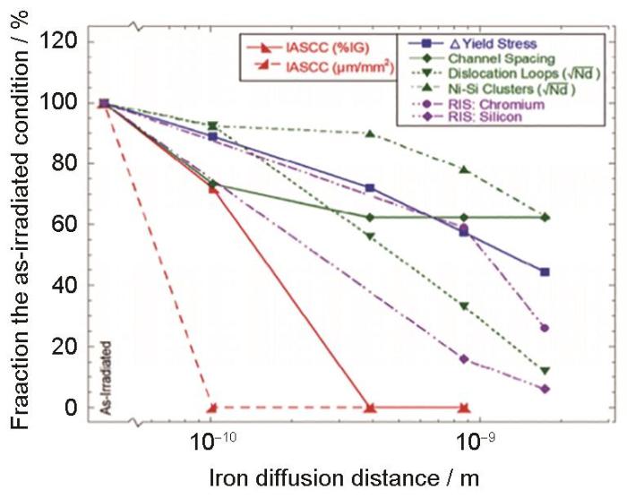 图6 IASCC敏感性和材料辐照诱导的特征随退火条件的变化图[86]