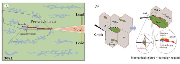 (1) 电化学效应:γ相易氧化,导致裂尖部分钝化,形成阳极,δ相不易氧化,形成阴极,γ/δ界面构成的微电偶腐蚀电池加剧γ相的氧化,使裂纹尖端严重钝化,导致裂尖应变/应力集中降低,裂尖扩展速率降低。