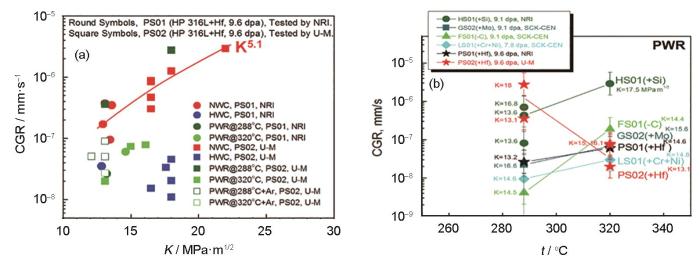 IASCC CGR随辐照剂量的增加而增加,且在8~10 dpa范围内达到饱和(图1a),值得注意的是,剂量对屈服强度的影响呈现出相同的趋势(图1b);此外,PWRs条件下每种中子辐照合金的CGR均随着应力强度因子(K)的增加呈现出增加的趋势(图2a),但具体的K指数仍受合金添加元素以及服役环境的影响[16];一般而言,在同等的K条件下,CGR随着服役温度的升高而增加(图2b),唯一例外的是合金PS02(+Hf),即掺杂Hf的高纯316L不锈钢(中子剂量9.6 dpa),其在288℃时的CGR比320℃高出约10倍左右。然而,温度对CGR的具体影响还需要在包括等效DH、电导率、ECP和加载历史等变量得到良好控制的实验条件下进一步验证。