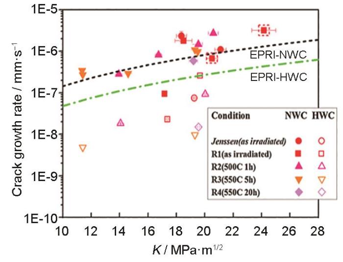 图8 辐照至5.9 dpa的304L不锈钢在不同退火条件和不同水环境下的裂纹扩展速率[54]