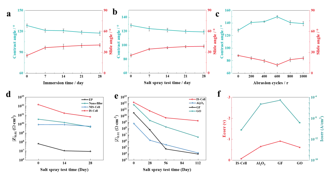 如图2所示,试验结果表明IS涂层具有相对出色的疏水稳定性、机械稳定性和长效耐蚀性。其在经历四周的盐水浸泡、盐雾侵蚀和1kg/1000g机械磨损后,IS涂层依旧保持稳定的疏水状态。IS涂层即使在液相腐蚀介质中浸泡112天后仍能保持优异的耐腐蚀性。最终的低频阻抗、自腐蚀电位和自腐蚀电流密度分别仅为1.68 × 109 Ω·cm2、-0.0708 V和5.38 × 10-11 A/cm2。在液相腐蚀介质中,IS涂层可长时具备相对优异的耐蚀性。