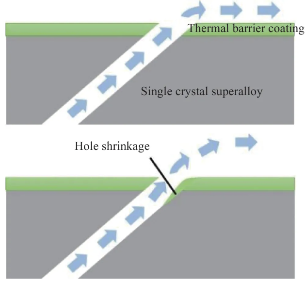 气膜冷却技术是支撑航空发动机热端部件承温能力提升的关键核心技术,使冷却气流经过气膜孔等冷却结构喷射而出,形成覆盖热端部件表面的冷却气膜,使其免受高温燃气的直接冲击。以涡轮叶片为例,其气膜冷却原理如图1所示。气膜孔的加工精度及质量决定了涡轮叶片的可靠性,进而影响着航空发动机整机的安全性。因此,对气膜孔提出了极为严苛的验收要求,也对其制造技术提出了挑战。在加工精度方面,主要评价要素包括孔径、孔位、圆度、圆柱度、轴线矢量角度、孔壁粗糙度及完整性等,它们决定了冷却气流流量、出射位置及角度、射流速度等,进而影响冷却气膜覆盖效率。在加工质量方面,主要关注不同制孔工艺所形成的孔壁/孔口处缺陷形态及深度,超标缺陷可能导致叶片在承受复杂交变载荷时发生断裂。据不完全统计,半数以上的发动机故障与发动机叶片的损伤与断裂有关。 图1 涡轮叶片气膜冷却原理示意图 涡轮叶片基材通常为难加工高温合金材料,气膜孔孔径一般为0.3~0.6mm,特别针对大倾角斜孔的深径比可高达13:1。因此,气膜孔加工通常采用特种工艺方法,主要包括电火花加工(Electrical-Discharged Machining,EDM)、电化学加工(Electrochemical Machining,ECM)与激光加工。随着叶片结构与制孔需求的多样化发展,不同制孔工艺也相应得到了快速发展,呈现出百家争鸣的态势。然而,气膜孔检测技术的发展则略显缓慢。其原因一方面与小孔几何尺寸及冶金质量的数据采集难度有关,另一方面也与单件叶片气膜孔数量众多、难以匹配制孔的生产节拍有关。事实上,将所有气膜孔的全特征要素进行检测并不现实,高性能航空发动机上仅高压涡轮叶片就包含数万个气膜孔,因此制孔精度与质量更多依靠制造工艺的成熟度与稳定性。此外,随着航空发动机性能需求的提升,燃气涡轮进口温度不断攀升,对冷气覆盖效率提出更高的需求。孔型设计也由早期的简单直圆孔演变为复杂异型孔,如簸箕孔、圆锥孔、水滴孔、猫耳孔等,为制孔工艺方法与制造符合性评价提出了双重挑战。 近些年航空领域蓬勃发展,气膜孔制造及检测技术也随之掀起研究热潮,本文综述典型制孔工艺的前沿进展与应用情况,并结合设计需求发展进行趋势分析与总结归纳,进一步指出气膜冷却相关技术的发展方向。 01|气膜孔制孔工艺 01 电火花制孔 电火花制孔是目前涡轮叶片制孔领域技术最成熟、应用最广泛的工艺方法,其加工效率较高、稳定性较好。基于工具和工件(正、负电极)之间脉冲性火花放电来蚀除被加工材料,以达到对工件特定尺寸、形状及表面质量的加工效果。电火花制孔参数中的电流与脉宽决定了单脉冲能量的大小,对加工质量的影响较为显著,脉停(即脉冲间隔时间)与内冲液压力跟放电产物(即残渣)的输运过程密切相关,因此对孔壁质量和加工效率同样影响较大。事实上,电火花加工技术在制孔领域能够大显身手,正是得益于空心管状电极的成熟应用,解决了大深径比小孔加工排渣的难题。 图2为高速电火花小孔加工过程的示意图,电极尖端放电不断在孔底蚀除金属基体材料,空心管状电极使高压内冲液得以循环流动,将放电产生的残渣输运走,避免其在孔底堆积,进而使脉冲放电过程稳定持续地向下推进。由于放电加工主要通过热熔方式去除材料,不可避免地在孔壁形成重熔层等热致缺陷。此前有学者认为,热致缺陷可能导致叶片在长期服役后萌生孔壁裂纹,在交变载荷作用下进一步扩展,造成叶片断裂。然而,不同电火花制孔装备及工艺所形成的孔壁重熔层,尽管在介观尺度下仅能通过重熔层厚度加以区分,但在微观组织形态上却可能千差万别。 图2 基于空心管状电极的高速电火花小孔加工过程示意图 董涛等曾报道高温合金电火花加工所形成的重熔层内包含大量微孔洞、裂纹等缺陷,以及不同熔池间所形成的胞状枝晶界面。但本课题组则通过开发低温高压内冲液及高频窄脉宽电源,基于单晶高温合金外延生长技术形成了单晶态的孔壁重熔层,为过饱和的、与基体取向完全一致的FCC晶格结构固溶体(图3、图4)。进一步采用热处理控制单晶重熔层内部的γ’相析出,形成了与单晶基体组织形貌完全一致的孔壁,彻底消除了重熔层。但不可否认的是,重熔层内部的微观孔洞、粗糙的孔壁表面均无法通过热处理组织调控予以消除,相比于重熔层这些几何缺陷的存在,这些因素才更可能与失效有关,需要引起更为深入的关注。 图3 单晶高温合金外延生长基体及重熔层衍射斑 图4 热处理调控的孔壁重熔层微观形貌 02 电化学制孔 目前能相对成熟地应用于叶片制孔的电化学加工工艺包括电液束(图5)与电火花−电解(图6)复合加工。电液束加工为在空心玻璃管内插入电极丝,酸性电解液在压力作用下由玻璃管尖端流出形成循环,进而基于电化学腐蚀原理去除被加工材料。电化学加工的优势在于对热致缺陷的控制,但在酸性电解液中单晶高温合金的γ相相比于γ’相会被优先腐蚀,使孔壁无可避免地形成电化学腐蚀层。电火花−电解复合加工是将电火花小孔机的高压内冲液由去离子水替换为盐溶液,进而在电火花加工尖端放电的同时,通过侧壁的电解反应去除孔壁重熔层。 图5 电液束制孔示意图 图6 电火花−电解复合加工示意图 由于孔入口段相比于出口段经历的电解腐蚀时间更长,一般入口段的重